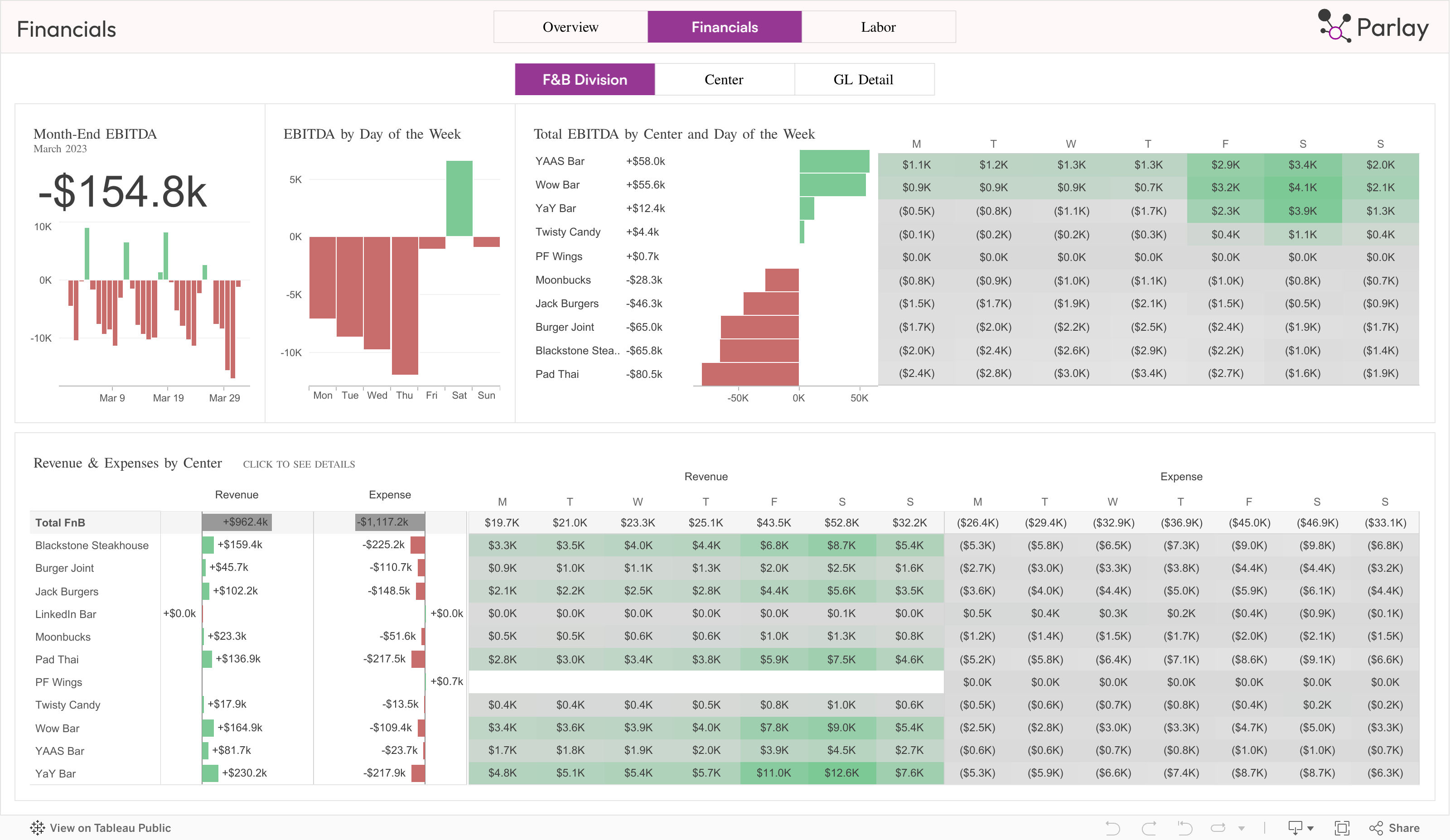 Parlay is the only tool on the market that allows you to monitor the profitability of your resort/casino operation on a daily basis, with a special focus on loss leaders such as Food and Beverage. Using our proprietary data module, the dashboard below calculates the operating losses by day for the Food Court, which then can be narrowed down to individual outlets. At this level, you are able to monitor the cover counts, the FTEs by job, and the overall metrics such as hotel occupancy to make actionable decisions to adjust operating hours.